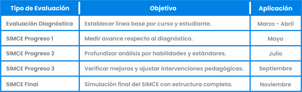 Estas evaluaciones están construidas según los Estándares de Aprendizaje y las Especificaciones Técnicas de la Agencia de Calidad de la Educación, asegurando confiabilidad, cobertura curricular y valor comparativo.