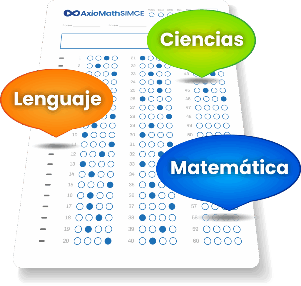 AxioMath SIMCE replica el formato, estructura y exigencia técnica de las pruebas nacionales aplicadas por la Agencia de Calidad. Cada año incluye una Evaluación Diagnóstica Inicial y cuatro evaluaciones de progreso tipo SIMCE, en las asignaturas de: